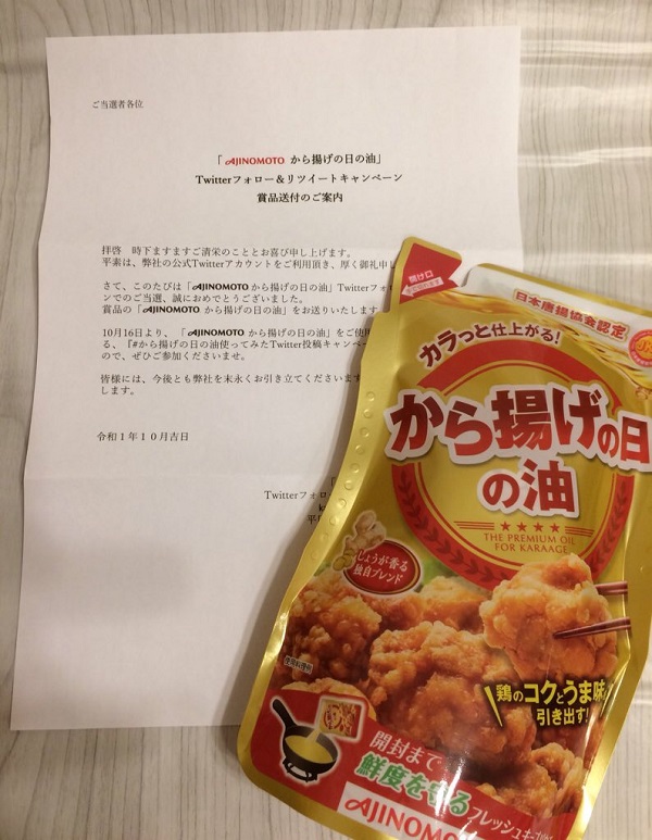 J-オイルミルズさまからDMいただいていた「から揚げの日の油」が届きました!