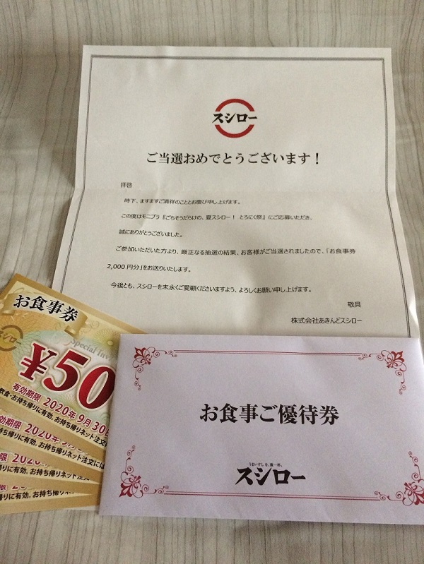 あきんどスシローさまから、お食事券2000円分いただきました 。